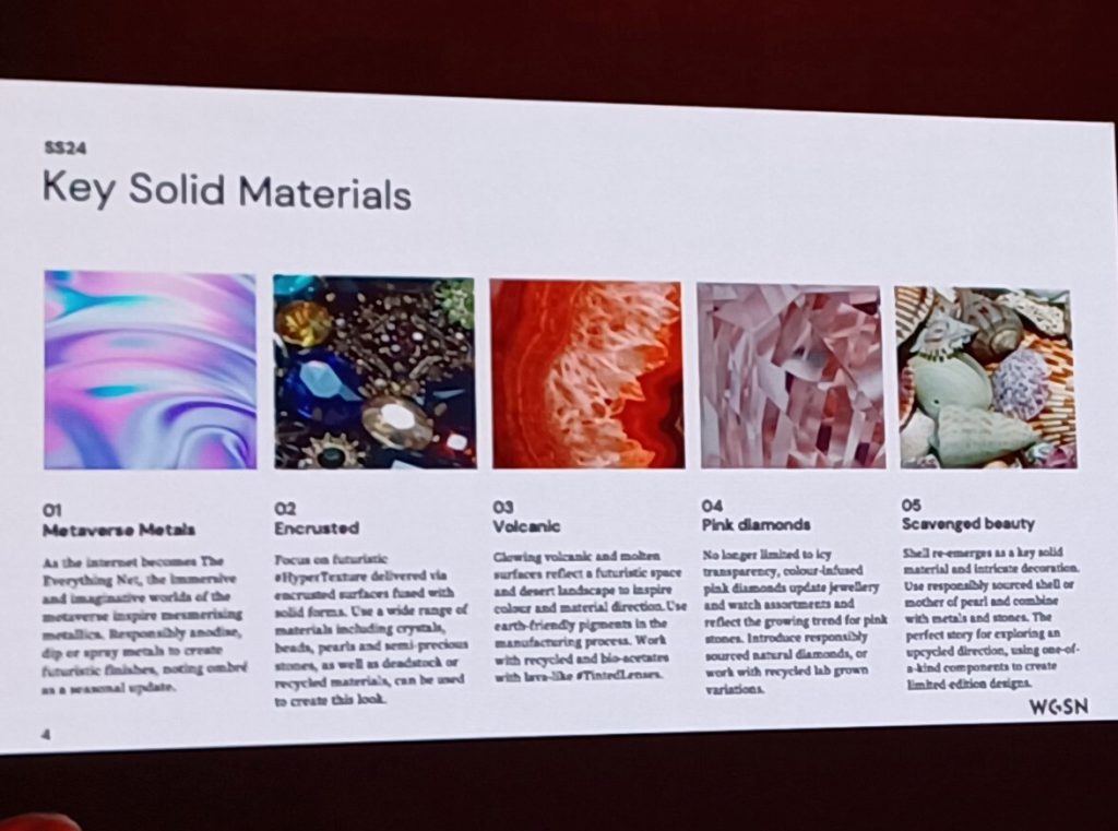 マテリアルは1、メタバース、2、散りばめられた素材 3、ブルカニック(火山)4、ピンクダイアモンド、5、クリーンビューティフレームは1、スリムレーサー、2、ファションシールド、3、フュチャークラシック、4、ジオメトリック、5、サラウンドウェーブ来年のトレンドはあくまで予測だが、どこまで効果的か今後が注目される。